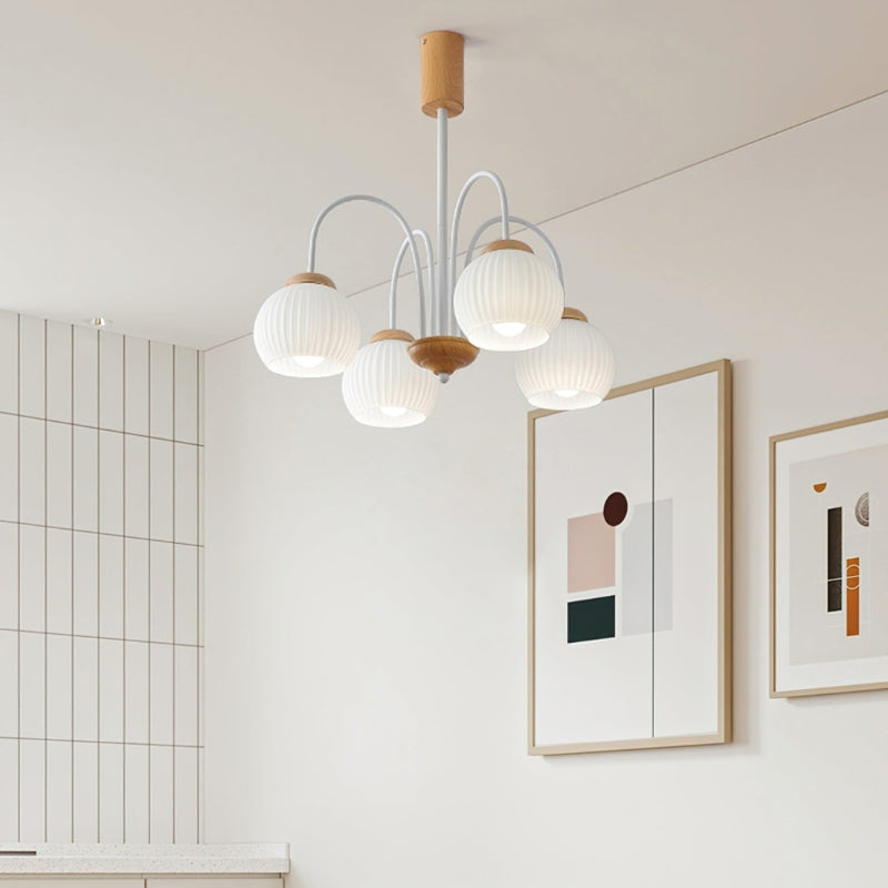 The DALIA chandelier combines wooden details and frosted glass shades to create a graceful, classic appeal. The natural wood tones soften the metallic structure, giving it a warm, organic feel while ensuring durability.